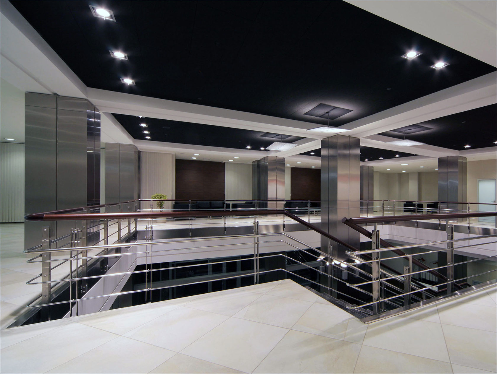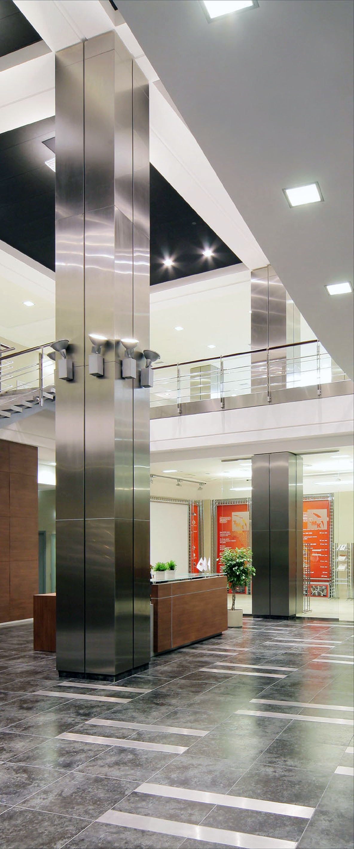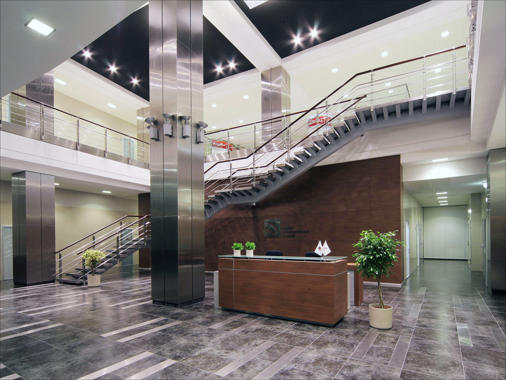 При создании «архитектурного интерьера» современного офисного здания, особое внимание было уделено не только входному вестибюлю и VIP этажам, но и в единое стилистическое решение всех транзитных и рекреационных пространств. Кроме того, в работе над проектом, пришлось учитывать большое число необходимого инженерного оборудования. Нам пришлось очень внимательно подходить к выбору материалов и системы их применения. Мы ставили перед собой задачу сделать интерьер не только архитектурно выразительный, но и максимально технологичный, где отдельные детали подчинены общей архитектурной концепции.