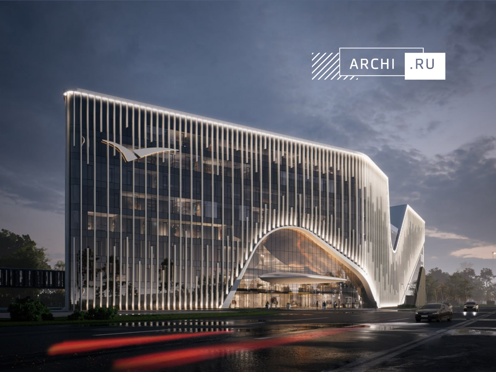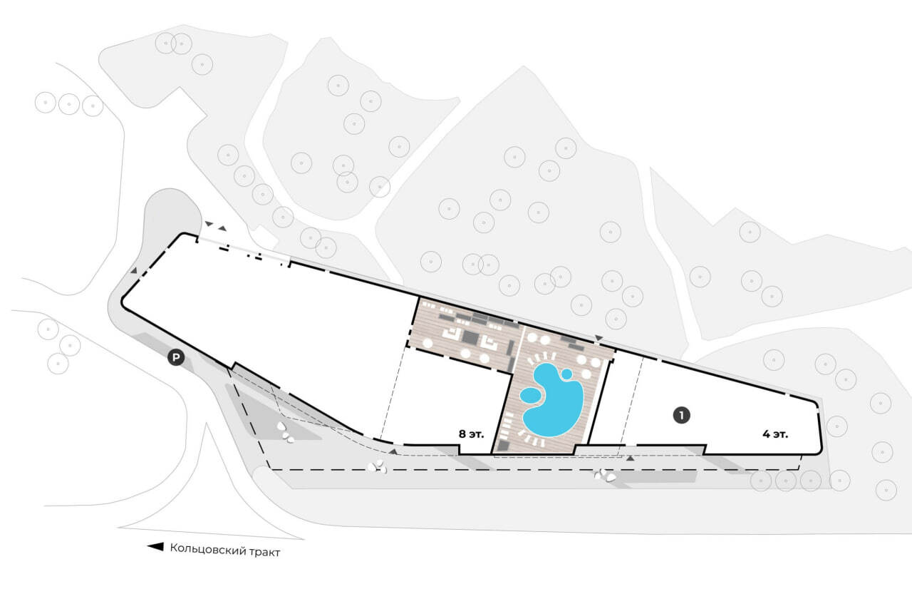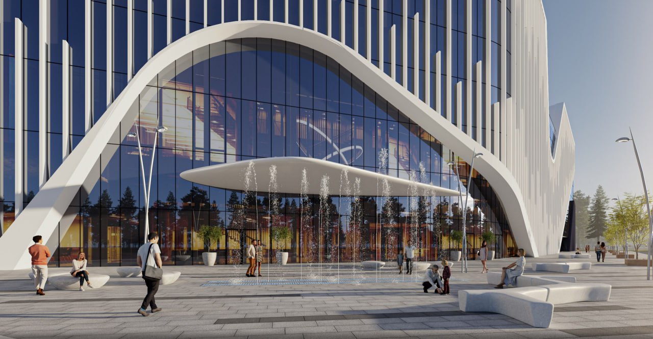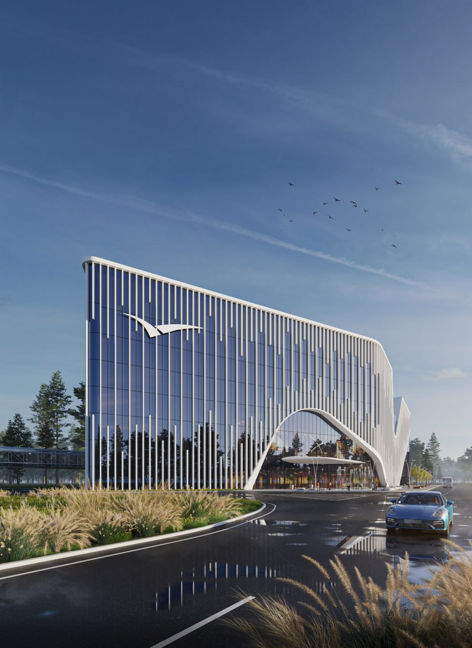 Комплекс расположен на центральном гостевом маршруте при въезде в город со стороны международного аэропорта Кольцово. Это один из первых архитектурных объектов, встречающих гостей и жителей Екатеринбурга, поэтому нам было важно сформировать респектабельный, современный и выразительный образ. Силуэт здания решён одной волной, описывающей его переменную этажность.