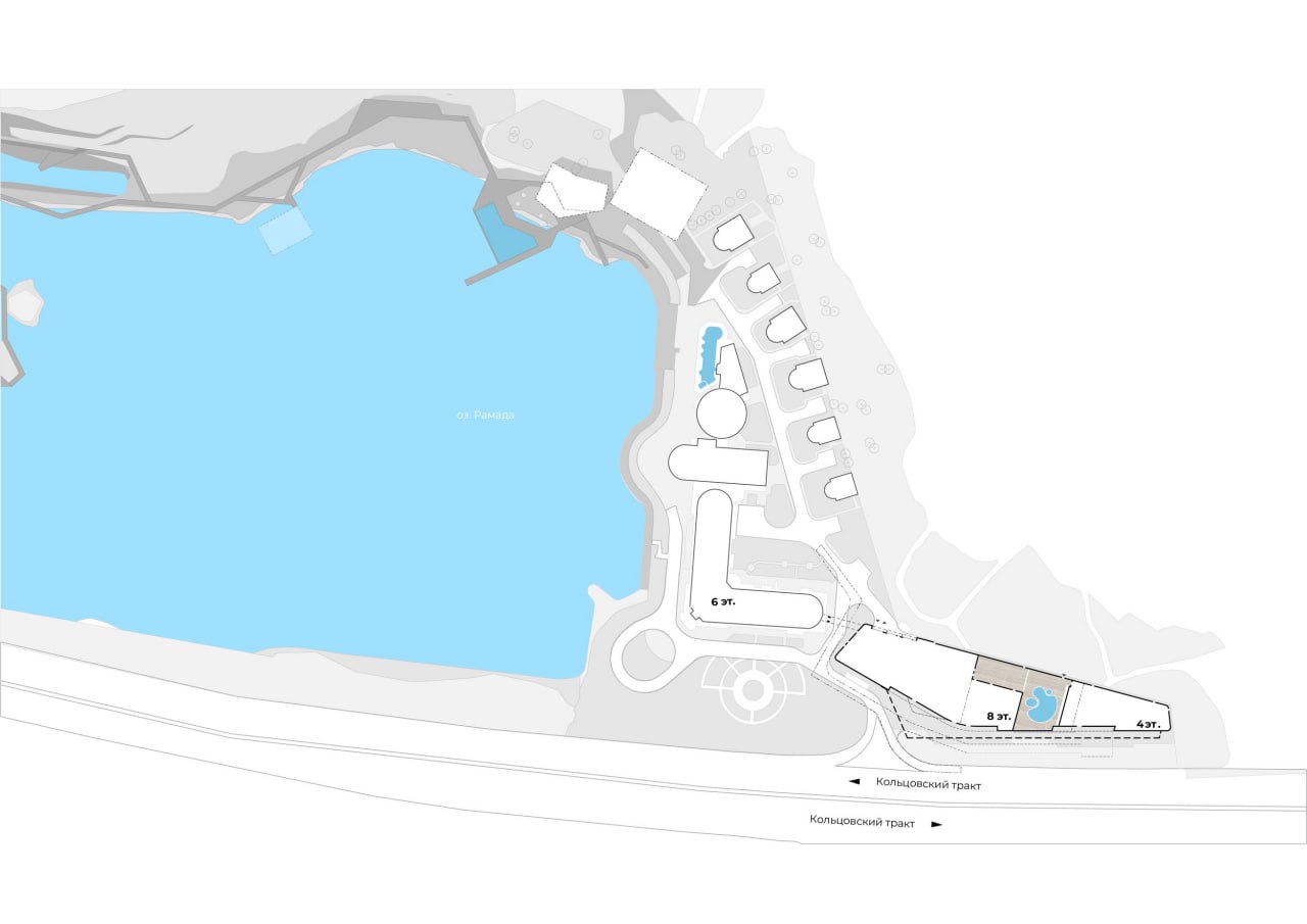 Говоря о благоустройстве набережной, стоит отметить, что изначально разрабатывались две концепции. Первая – непосредственно в рамках строительства второй очереди отеля с термальным комплексом и аквазоной. Вторая – более масштабная концепция благоустройства территории вокруг всего озера, объединяющая существующие объекты, зоны отдыха и формирующая единое рекреационное пространство.